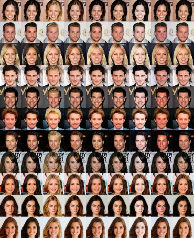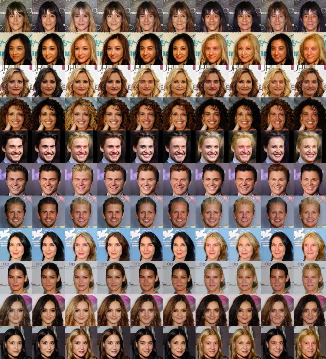 第一列和第六列为输入图像,其余列均为StarGAN生成图像。该模型在RaFD数据集中训练得到新数据集CelebA,并用单个生成网络产生了各种人脸,其中面部表情标签来自RaFD