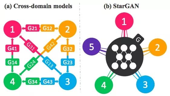 最近的研究显示,学界已经在两个域图像到图像转换上取得了长足进展,但是,这些方法在可扩展性和鲁棒性上仍有诸多局限,且效率低下。当需要对k个域上的图片进行图像转换时,现有模型需要事先训练好k(k−1)生成器。如下图(a)所示,只有当12个生成器都完成训练,该模型才能实现转换,同时,模型虽然能习得4个数据集的所有特征,但生成器得到的只是两个域的特征信息,因此它无法对整个数据集做到充分、合理利用。