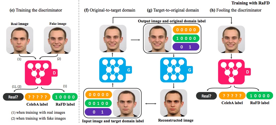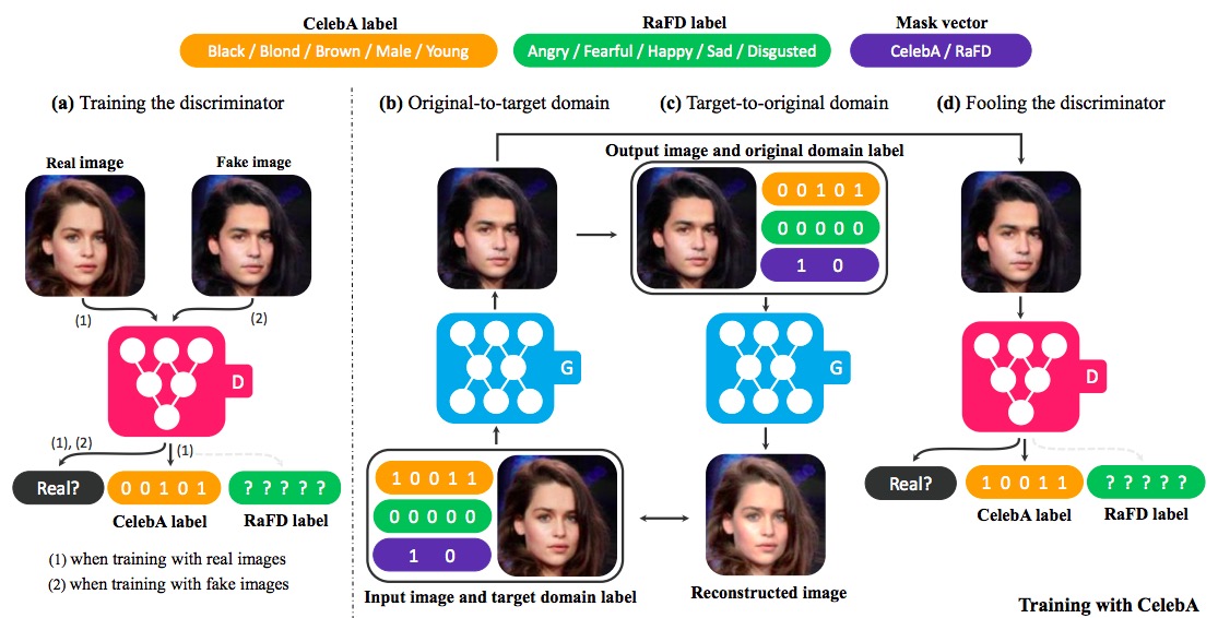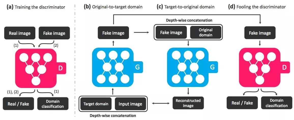 当一真一假两组图像数据集输入模型后,判定器D首先负责从中归类出它认为是“真的”的特征,并放进一个相应的域类(domain classification)(图a)。随后,研究人员将测试图片和目标域(希望转化的方向)输入模型,由生成器G结合两者信息生成一幅“虚假”图像,再将“虚假”图像结合目标域输入模型训练(图b)。接收到新的输入信息后,生成器G根据目标域信息尝试把“虚假”图像还原成原始图像,并将重建的新图输入前一个步骤(图c)。判定器D根据生成器G传来的“虚假”图像,试图从中分离出和真实图片难以区分的特征,并归类到D的目标域(图d)。