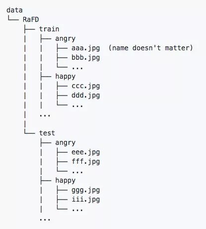 RaFD全称Radboud Faces Database,是一个包含有4824张图片的数据集,它内部可分为67类(包括高加索地区男性、女性、儿童及摩洛哥男性等),每一类都包含从3个角度捕捉到的8种面部表情。研究人员也对图像做了调整,他们从原图中截取了大小为256 × 256的脸部特写,将尺寸调整为128×128,并从中抽取10%的图像作为测试集,保留剩下的90%为训练集。