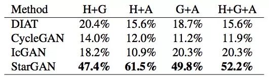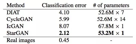 为了凸显StarGAN的效果,研究人员设置了3个对照组:DIAT、CycleGAN和IcGAN。前两者都是跨领域模型,可用来比较模型在执行单一或多属性传输任务时的表现。它们采用的方法是多步骤转换,如在更换头发颜色后再改变性别。