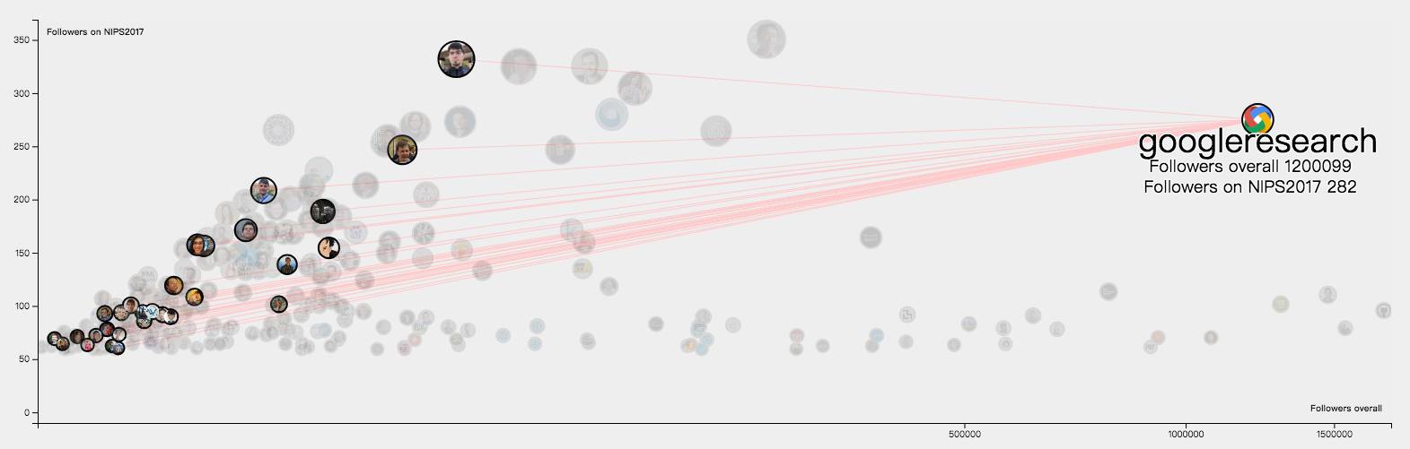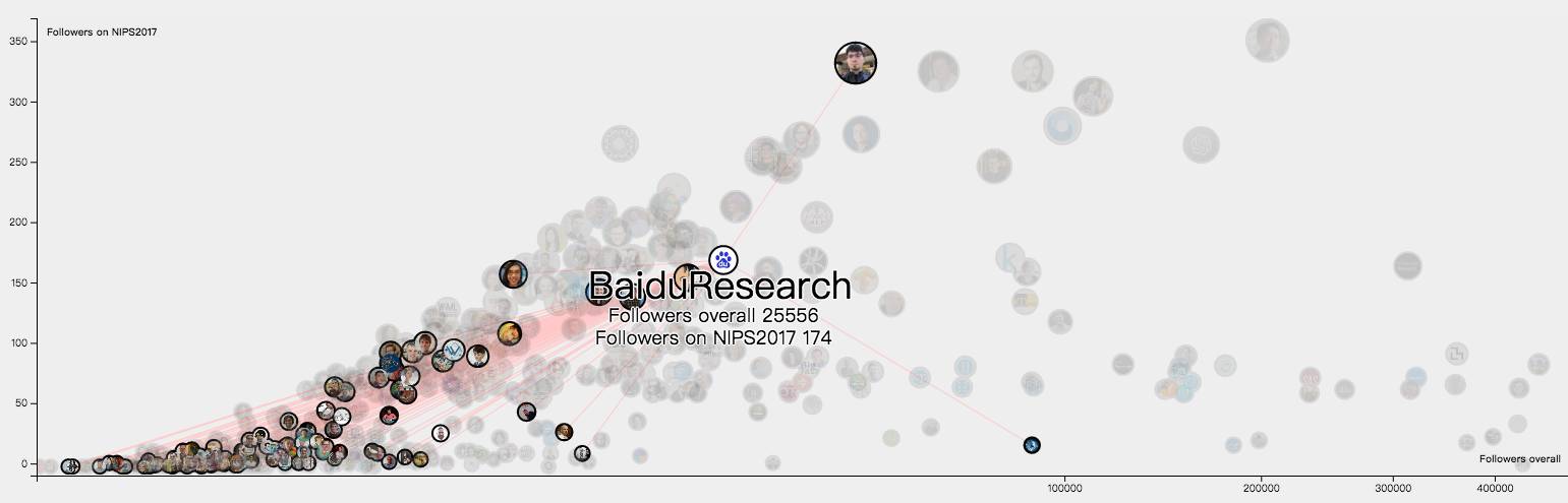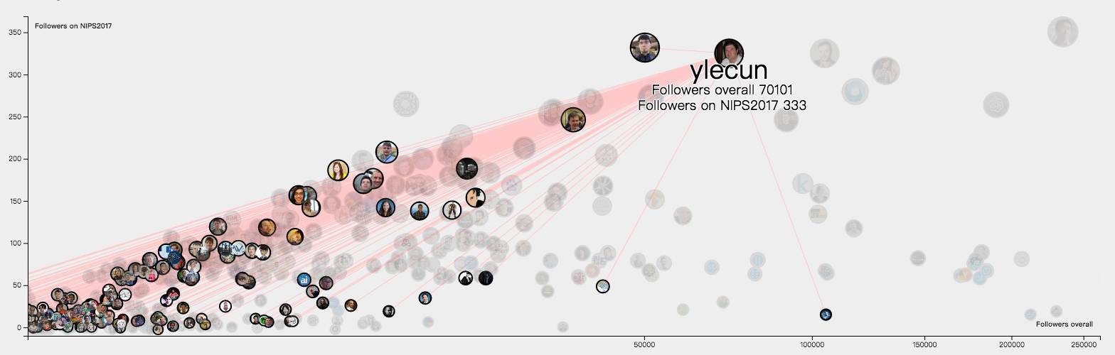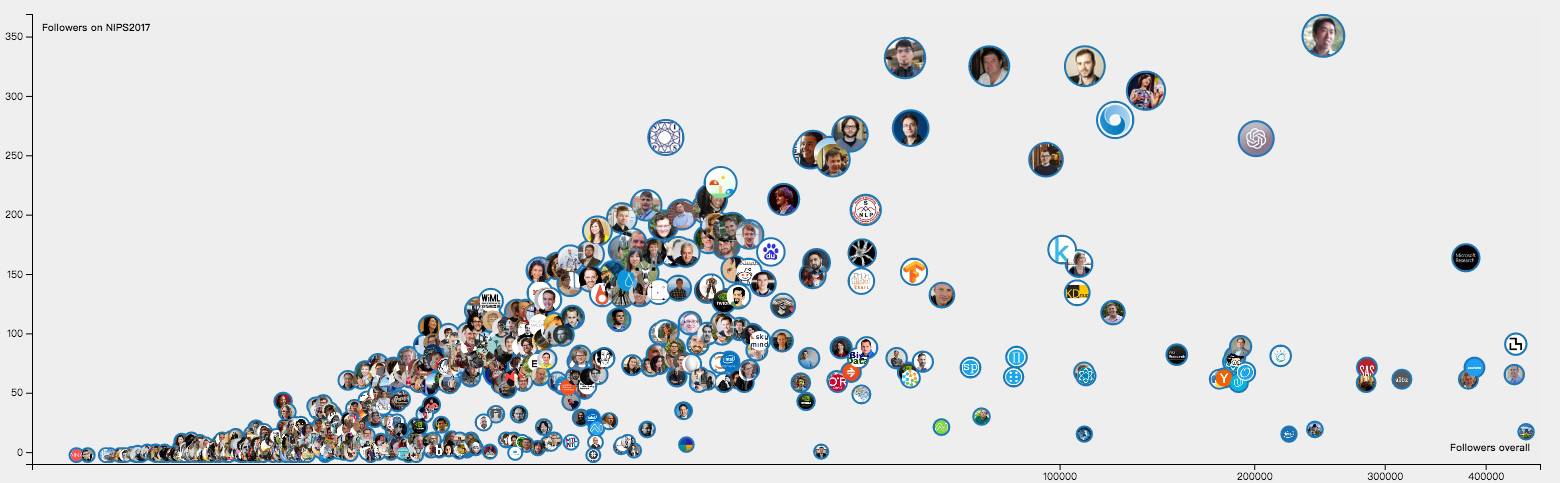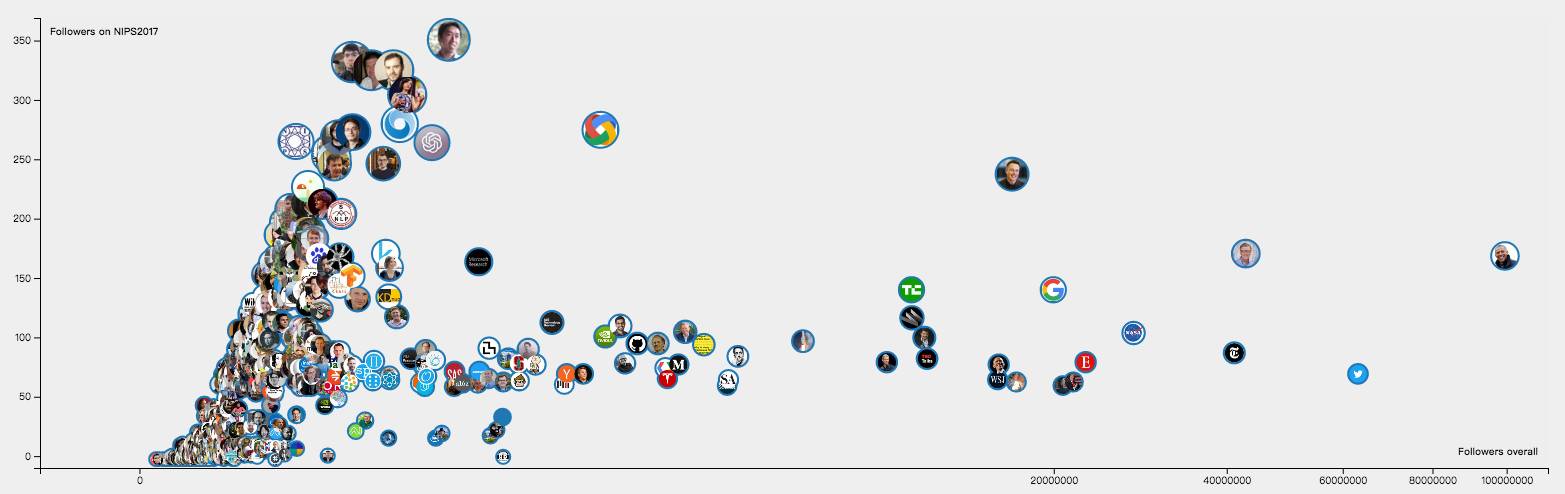 横轴表示Twitter账号的总粉丝数,纵轴表示参加了NIPS 2017的粉丝数