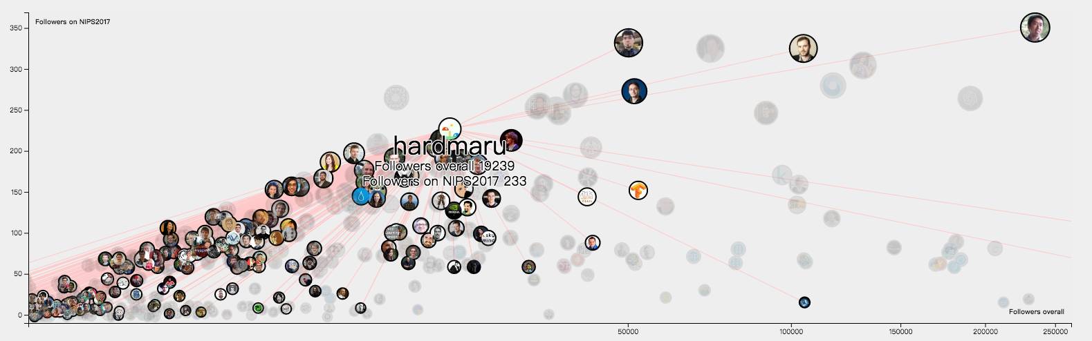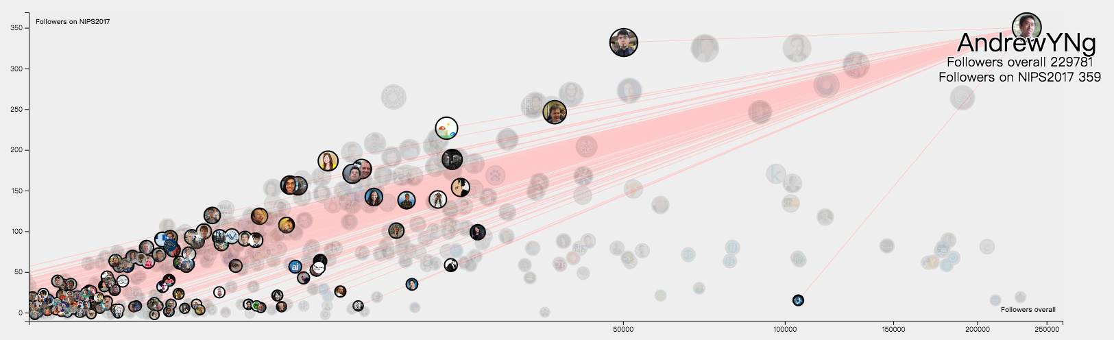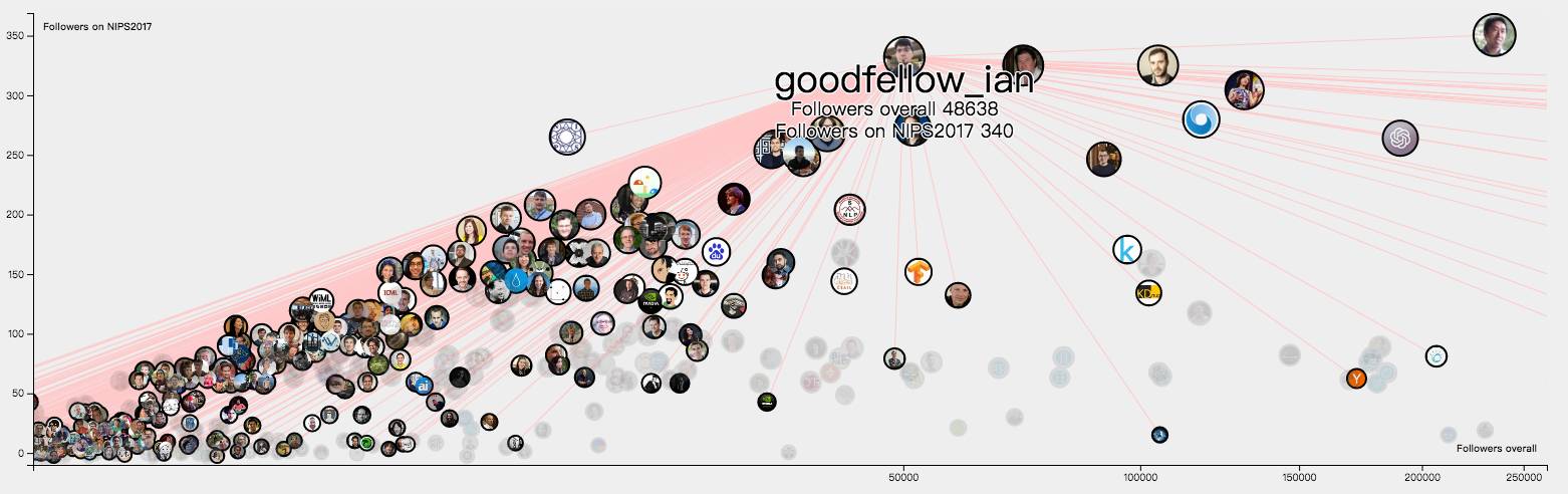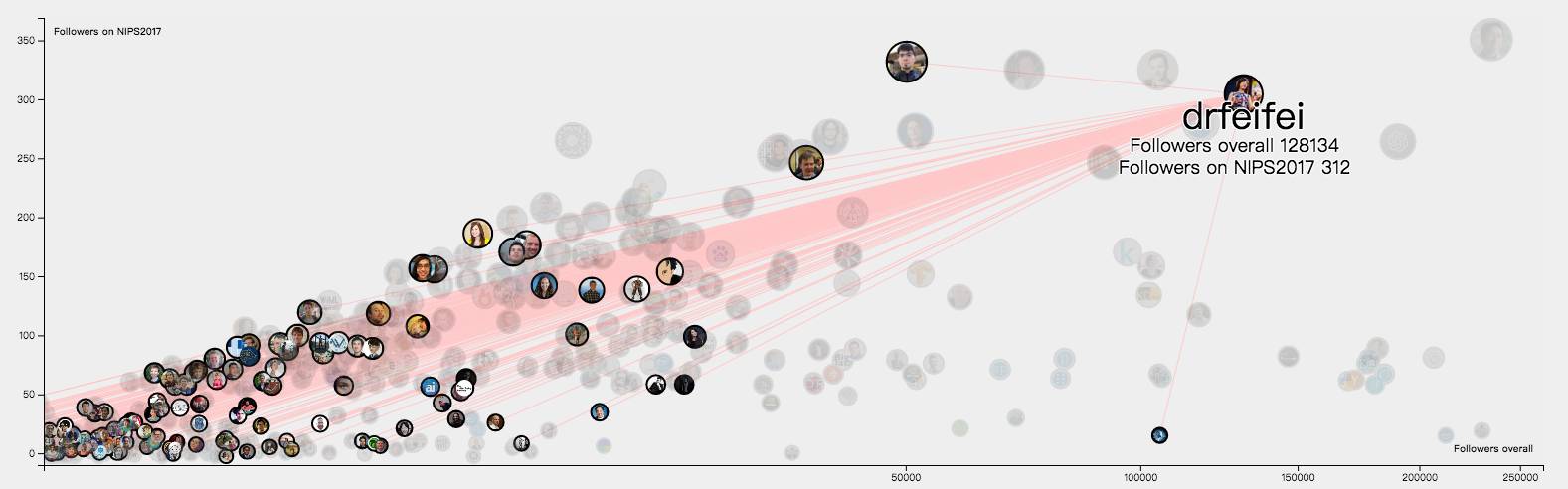 横轴表示Twitter账号的总粉丝数,纵轴表示参加了NIPS 2017的粉丝数