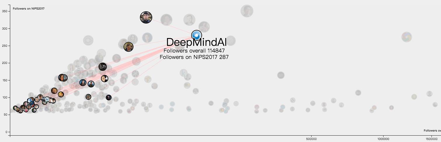 在这幅眼花缭乱的图中,我们粗略统计了最受NIPS观众关注的各大研究机构。排名第一的是DeepMindAI,谷歌研究院紧随其后。