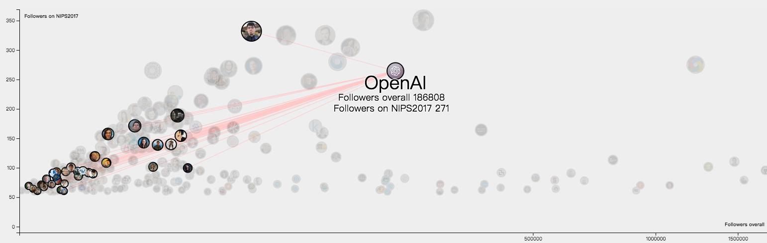 今天Twitter的一名工程师John Alexis Guerra Gómez就统计了2017年12月1日到12月11日之间,至少发了5条带有#NIPS 2017 话题的496个用户,在他们的关注列表中找出了其中最受机器学习爱好者欢迎的账号,最终共有737人。将数据可视化后做成了一张十分详细的图表,在这里你可以看到这737位行业大咖们的排名以及相互关系。也就是说,这可能是最完整的与人工智能相关的Twitter账户集合。