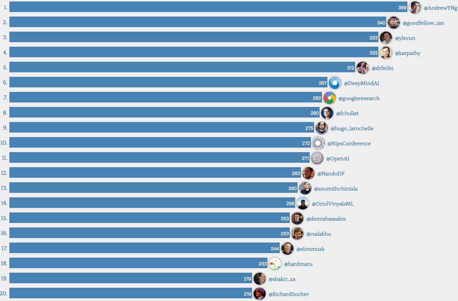 可以看到,除了吴恩达外,GANs之父Ian Goodfellow、人工智能大牛Yann LeCun、特斯拉AI总监Andrej Karpathy以及斯坦福大学教授李飞飞等都榜上有名。