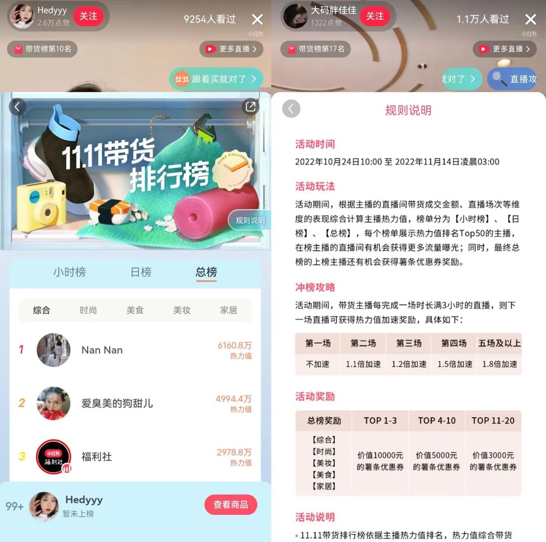 双十一期间还设置了带货排行榜,参与活动的主播能获得官方扶持,排名靠前的主播除了获得更多流量曝光,还有官方的优惠券奖励。