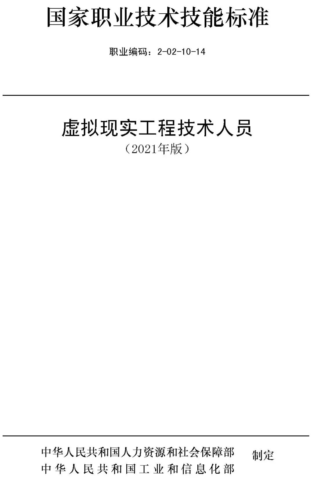 2021年9月29日,人力资源社会保障部办公厅、工业和信息化部办公厅正式颁布实施了《虚拟现实工程技术人员国家职业技术技能标准》 (以下简称《标准》),该《标准》由中国图象图形学学会作为主要起草单位,中国图象图形学学会副理事长、北京理工大学王涌天教授,中国图象图形学学会副秘书长、北京理工大学刘越教授作为主要起草人。