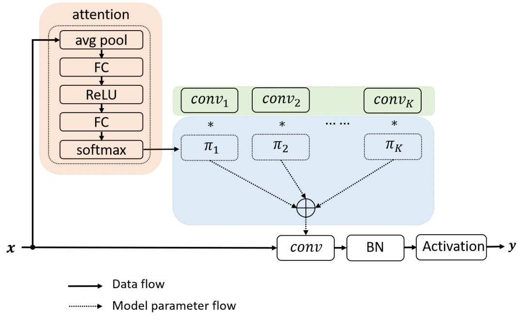 动态卷积没有在每层上使用单个卷积核,而是根据注意力动态地聚合多个并行卷积核。注意力会根据输入动态地调整每个卷积核的权重,从而生成自适应的动态卷积。由于注意力是输入的函数,动态卷积不再是一个线性函数。通过注意力以非线性方式叠加卷积核具有更强的表示能力。