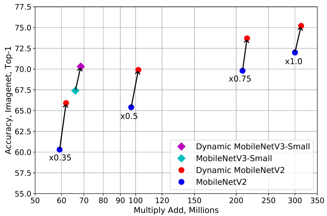 动态网络引入了两部分的额外计算:注意力模型和卷积核的叠加。注意力模型计算复杂度很低,由 avg pool 和两层全卷积组成。得益于小的内核尺寸,叠加多个卷积核在计算上也非常高效。因此,动态卷积引入的额外计算是非常少的。少量的额外计算与显著的表达能力的提升使得动态卷积非常适合轻量级的神经网络。