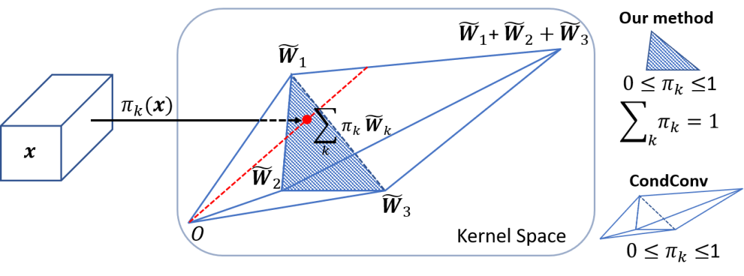 动态卷积网络的难点在于多个卷积核和注意力模型的共同学习。这个困难会随着网络深度的增加而增加。本文提出,解决这个问题有两个关键点。首先,限制注意力的取值将简化注意力模型的学习。注意力取值的限制将缩小多个卷积的叠加核的取值空间。文中将注意力取值限制在0与1之间,同时所有注意力的和为1。如图3所示,如果使用3个卷积核,注意力在0与1之间把叠加核限制在两个三棱锥中,注意力的和为1把叠加核进一步限制在以这三个卷积核为顶点的三角形中。对于这两个限制,softmax 是一个很自然的选择。