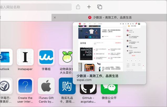 Safari 对标签页做了略微的调整来实现更快速地导航,目前来看主要的改动体现在标签预览上。我们把光标停留在 Safari 的标签上时,Safari 会自动加载页面的预览,来方便我们快速进行选择,在有多个标签页打开的时候,这个悬停预览功能非常有用。