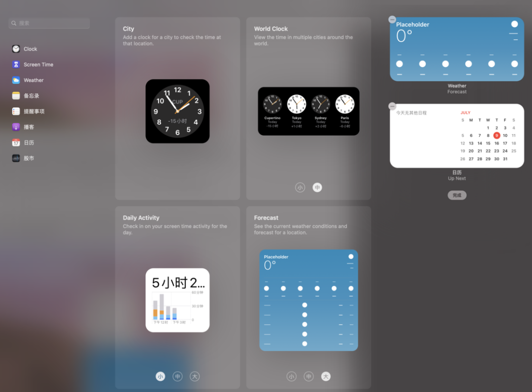 小组件方面,macOS Big Sur 同样支持小、中、大几种大小的尺寸,未支持移动平台上的智能叠放功能。需要注意的是,此前的应用小组件在 macOS Big Sur 全部不可用,目前也没有应用支持新版小组件,还需要等待开发者对于新系统功能进行适配。