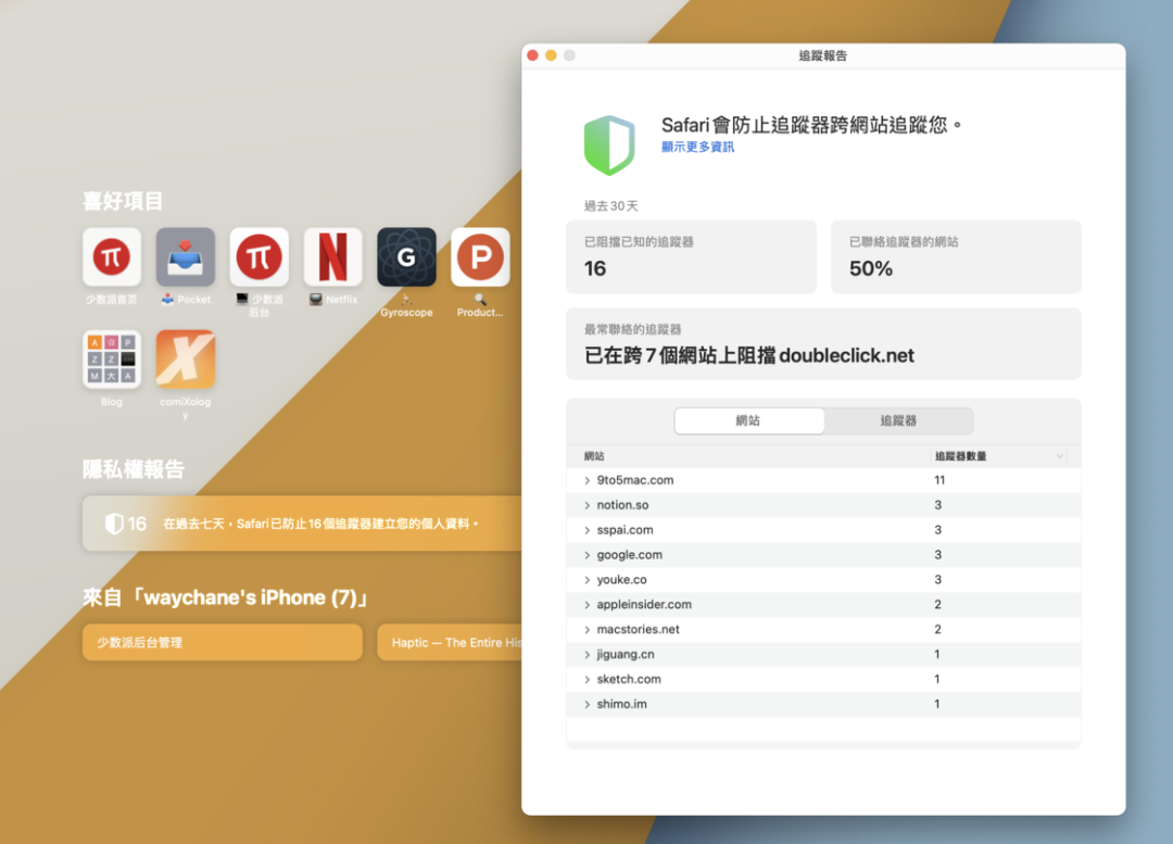 在起始页,Safari 也增加了「隐私权报告」模块,这里会以周为时间单位更新报告,让我们了解过去七天有多少网站尝试追踪我们的个人资料,以及 Safari 拦截了多少对于隐私的追踪请求。
