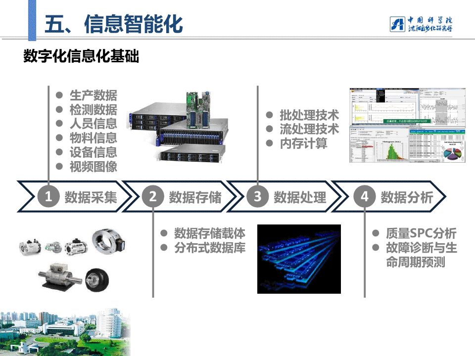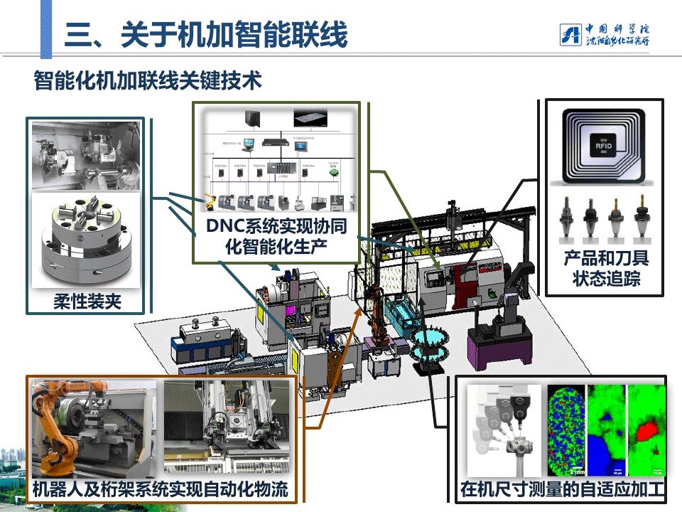 同时,他还介绍了智能化机加联线,智能化机加联线是智能制造重要部分,涉及的关键技术包括通过机器人及桁架系统实现自动化物流、基于快换夹具系统实现柔性装夹、基于RFID技术实现线上产品和刀具状态追踪、基于在机尺寸测量技术实现产品自适应加工,通过DNC系统的工艺文件管理、NC程序、刀具管理模块实现数据加工设备间的协同化智能化生产。