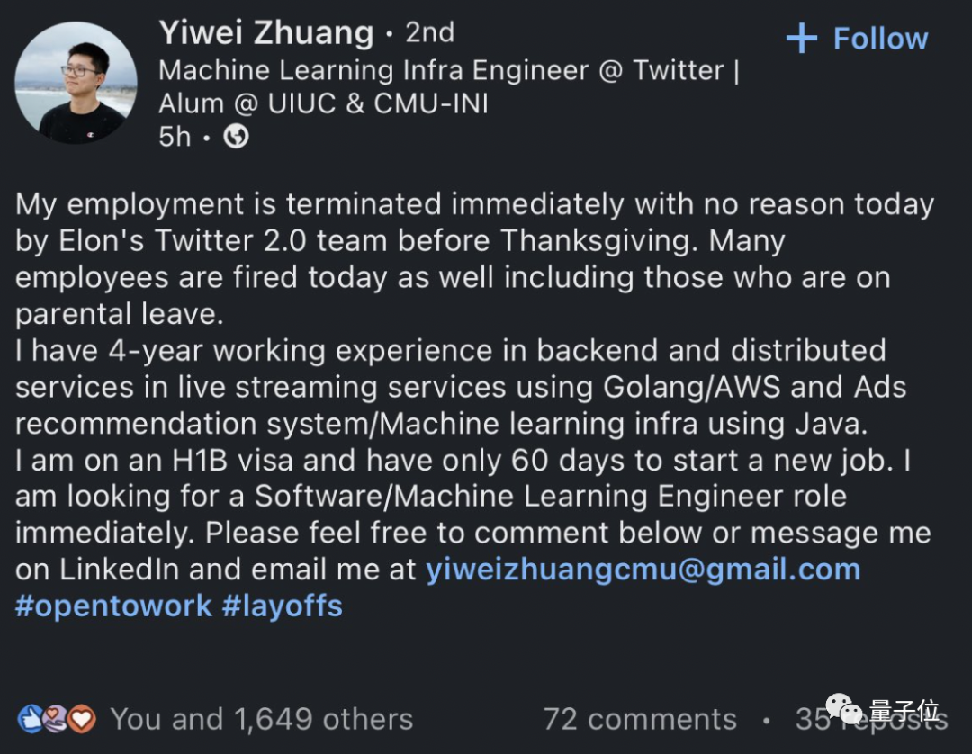 除了Ihara,还有一位工程师Yiwei Zhuang在领英上自述,自己无缘无故就被马斯克的推特2.0团队裁了。