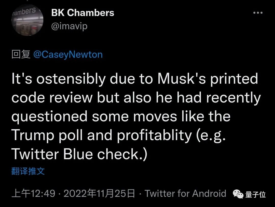 有知情网友指出,代码审查只是表面原因,真实原因是他质疑了马斯克恢复特朗普账号、蓝V认证等一系列举措。