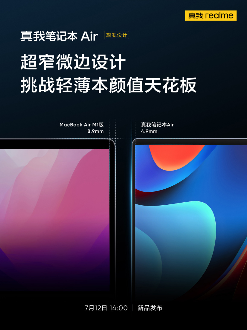 realme 官方今日宣布真我笔记本 Air 官宣将于 7 月 12 日 14:00 发布,号称配备 4.9mm 超窄微边屏。该笔记本在 A 面采用棋盘格设计,可以看到左侧的双 USB-C 接口、3.5mm 音频接口,右侧为双 USB-A 接口。这款真我笔记本 Air 预计将搭载英特尔第 12 代酷睿处理器,在与 realme 手机的生态配合方面也会有改进。另外,从海报可以看到,真我笔记本 Air 的左侧边框非常窄,预计屏幕显示将是该设备的一大卖点。