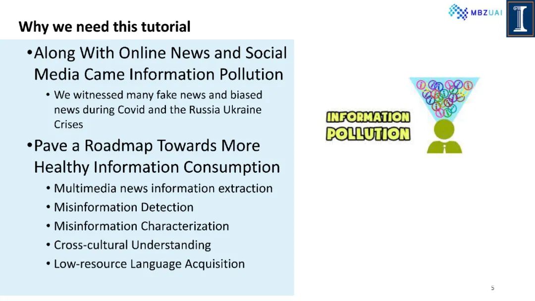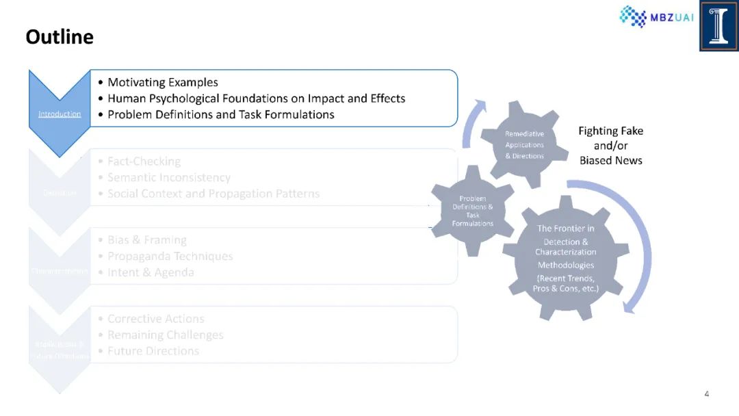 我们选择了一些真实世界的假新闻及其对社会的有害影响作为教程主题的开始,然后进行了一个教学练习,介绍人类如何处理假新闻的检测、表征和纠正问题。我们将指出各种类型的假新闻在概念上的区别,包括新闻新闻中对错误归因或不存在的事件的严重捏造,过度耸人听闻的点击诱饵,旨在被传统新闻网站转载的虚假新闻和模仿真实新闻但包含讽刺和荒谬的讽刺。例如,一般来说,新闻文章更有可能涉及严重的捏造,而社交媒体上的帖子则更多地涉及讽刺和恶作剧等幽默。我们还将描述导致人们形成或认可错误信息观点的认知、社会和情感因素(如直觉思维、虚假真相、来源线索、情绪等),以及错误信息被纠正后知识修正的心理障碍,包括纠正不整合、选择性检索和持续影响理论。