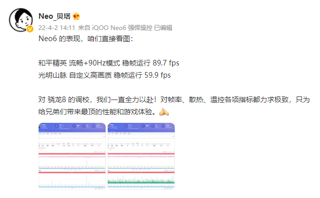 今天,iQOO Neo产品经理 @Neo_贝塔 晒出两张 Perfdog 测试截图,并认领了安兔兔官微抓取的 1065001 跑分 ,显示即将发布的 iQOO Neo6 将会有亮眼游戏稳帧表现的同时,保持高水平跑分。