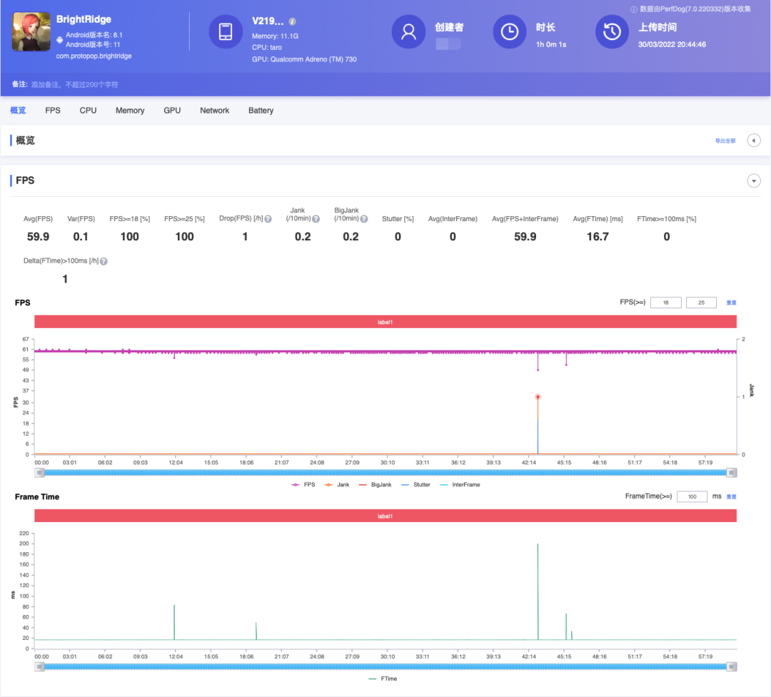 两张 Perfdog 测试截图分别为稳定在 60fps 左右运行的《光明山脉》以及稳定在 90fps 左右运行的《和平精英》。以《光明山脉》为例,这是一款重负载热门手游,十分考验手机的极限性能。iQOO Neo6 在自定义高画质模式下平均帧率可以达到 59.9fps,波动小、持续时间长。