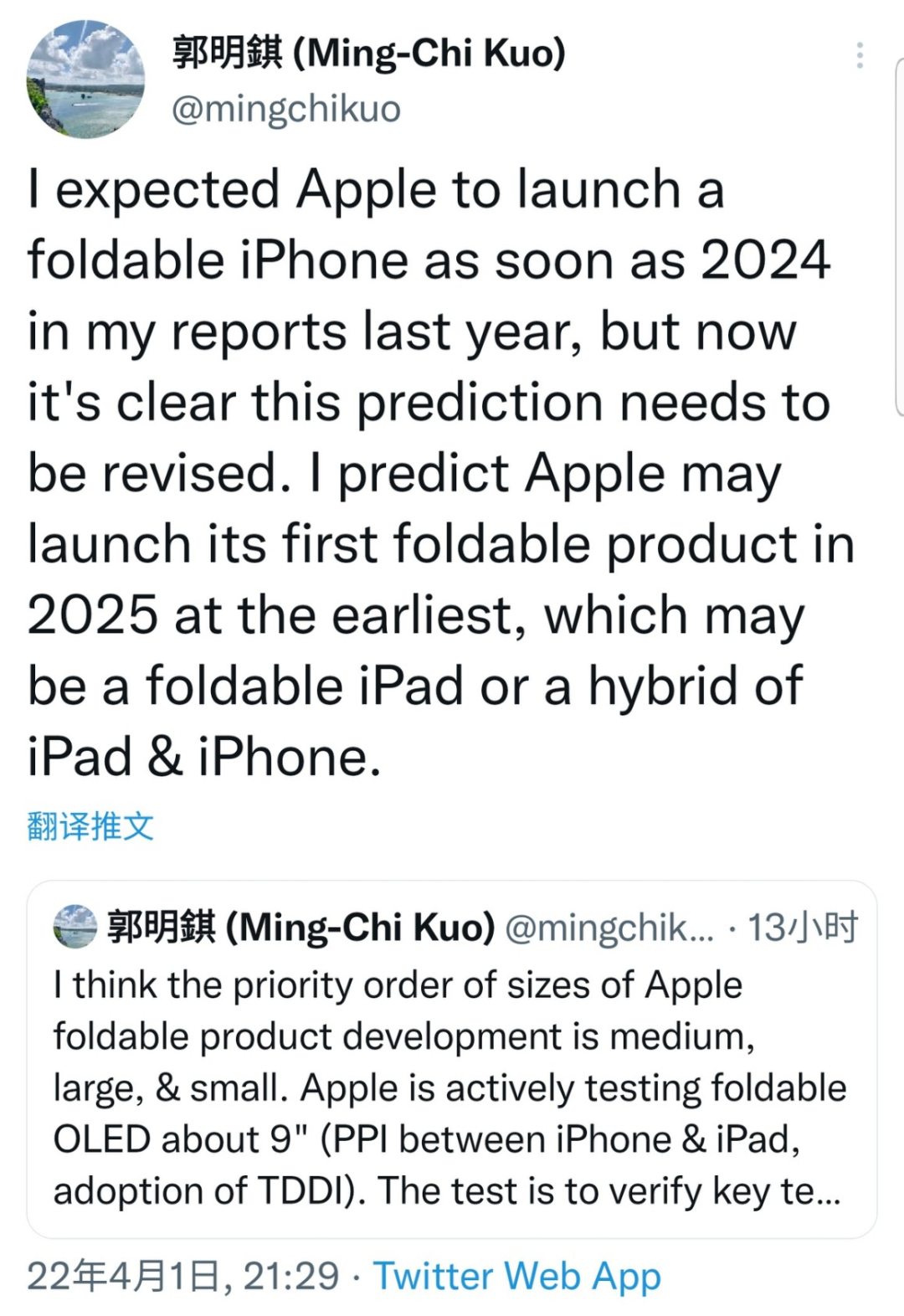 值得一提的是,天风国际分析师郭明錤也进行了转发并带来最新爆料。郭明錤透露,苹果正在积极测试 9 英寸左右可折叠 OLED,测试是为了验证关键技术,可能不会是最终产品规格。他还表示,苹果将先推出中等尺寸折叠屏产品,然后是大尺寸折叠屏产品,最后才是小尺寸折叠屏产品。除此之外,他还预测苹果首款可折叠屏产品的推出时间最早可能要等到 2025 年,并称这款产品可能是 iPad 和 iPhone 的混合体。