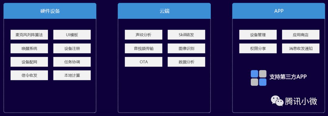 接⼊小微平台的设备可通过智能语音对话使用音乐、FM、新闻、视频和天气查询等内置技能,并通过开放技能平台创建配置自定义技能。小微不仅实现了传统硬件到智能硬件的升级,也在通过新的方式连接用户和微信生态下内容和服务。