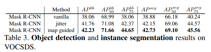 研究人员还使用 Mask R-CNN 在 VOCSDS 数据集上进行实验,目标检测和实例分割提升分别是 4.2mAP 和 3.9mAP,仍旧十分可观。