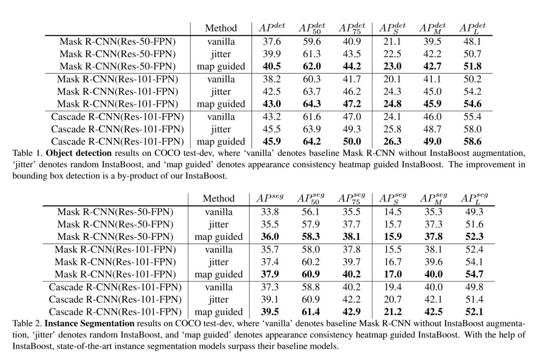 在实验过程中,作者使用 Mask R-CNN 和 Cascade R-CNN 两个框架在 COCO 数据集上分别进行了测试,测试结果如下图所示。结果显示,在目标检测和实例分割任务上,InstaBoost 在 mAP 标准下最高带来 4mAP 和 2.2mAP 的提升。