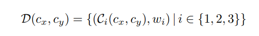 外观距离定义为,外观描述符之间局部外观一致性的度量。由于我们已经定义了具有三个轮廓区域和相应权重关联描述符,D1=D(c1x, c1y) 和 D2=D(c2x, c2y) 之间的外观距离被定义为: