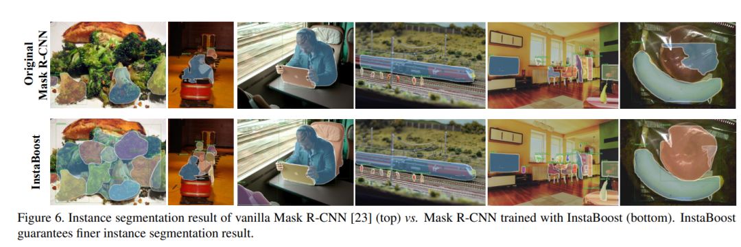 为了更直观的反应 InstaBoost 对实例分割效果的提升,这里列出部分可视化对比结果: