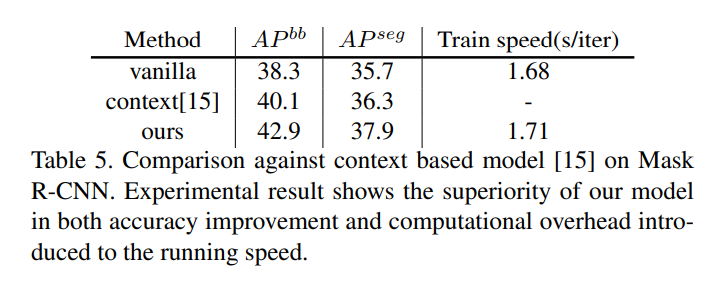 从速度上来看,InstaBoost 可以作为在线算法嵌入到 dataloader 内部,在 Mask R-CNN 上对比,使用前后每轮迭代仅增加了 0.03s 的时间成本。而使用 context model 的算法,需要对特定数据集预先进行训练等操作,花费大量额外时间,并且难以作为在线算法内嵌到代码框架内。