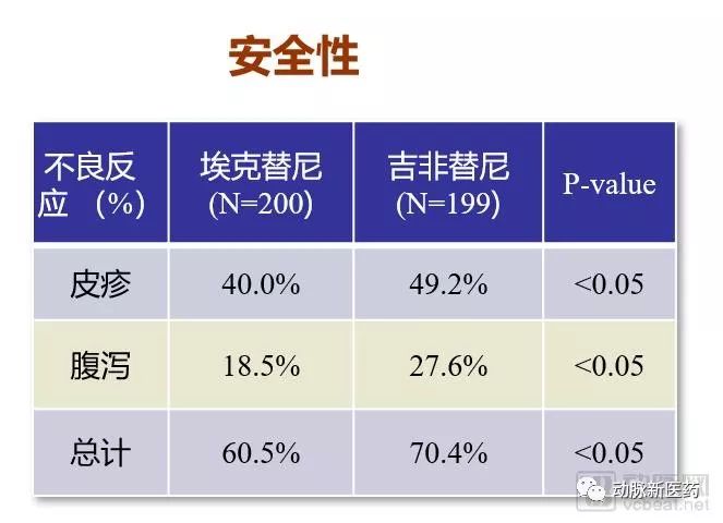 令人兴奋的是,最后的开盲结果显示,埃克替尼具有很好的临床效果,二、三线治疗晚期非小细胞肺癌患者疗效和吉非替尼相当,不良反应更少。