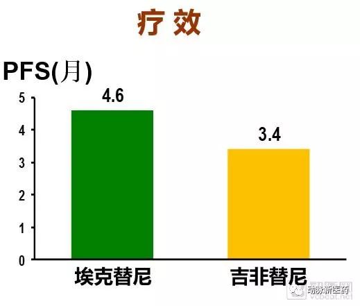 整体曲线相比吉非替尼略高,主要终点PFS(月),埃克替尼为4.6月,吉非替尼为3.4月,中位PFS提高了1.2个月,没有显著的统计学差异。次要终点TTP,埃克替尼中位TTP延长了1.5个月,存在统计学差异。常见不良反应埃克替尼更少,总不良事件统计为60.5%,吉非替尼为70.4%,埃克替尼的安全性更好、患者耐受度更佳。