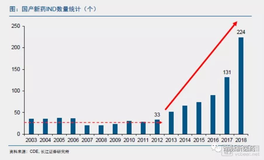 2012-2018年,国产新药临床申请(IND)数量大幅攀升。2017年,国产IND数量达到131个,同比增长46%;2018年,国产IND数量达到224个,同比增长71%。新药IND的持续增长给创新配套的CRO和CMO带来长期趋势性利好,同时也产生了临床资源的争夺。中国的医药创新已经从仿制开始逐步在往创新方向转变。
