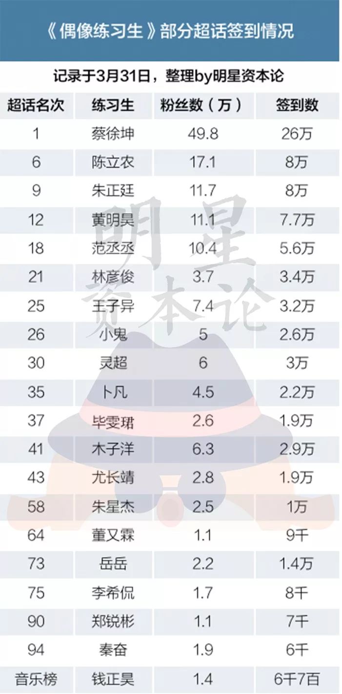 出道战期间的1.8亿票,平均到每天也就是1286万票,刨除一部分路人投票,参考练习生们的前100超话签到人数,也就是核心粉丝数量,我们可以看到加一起也不到100万,其中蔡徐坤断层26万+,其他从5千-8万不等。所以,粉丝需要通过打投组快速建立优势。