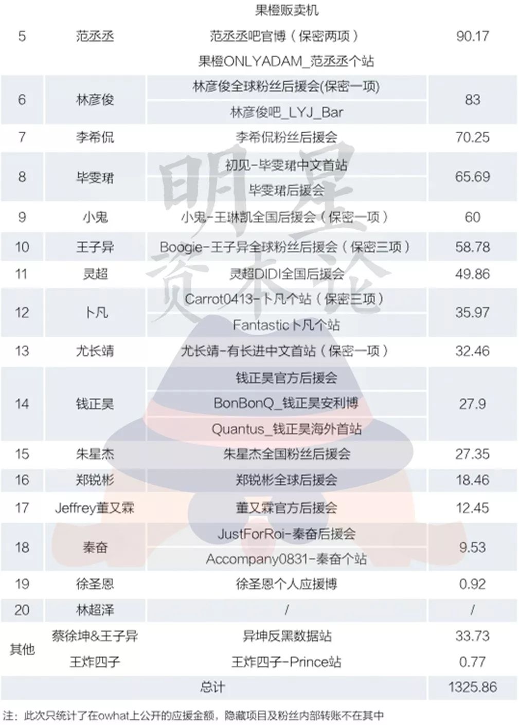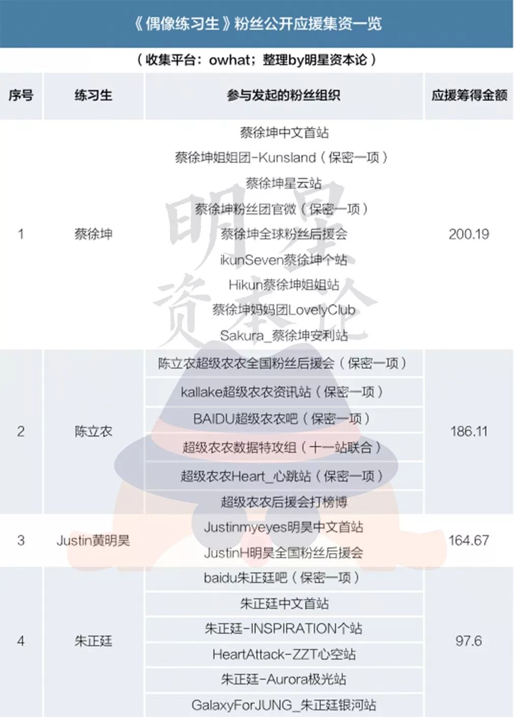 据明星资本论统计,3月中进入决赛以来,仅是在粉丝应援平台owhat上,《偶像练习生》前20名的练习生粉丝就集资了超过1300万,参与的粉丝组织近50个,这还只是公开的集资金额,为了在决赛阶段不暴露底牌,各家粉丝组织有意隐藏了部分集资金额。如果算上隐藏金额和散粉自发参与的投票活动、同款购买,保守估计粉丝将贡献出了2000万。