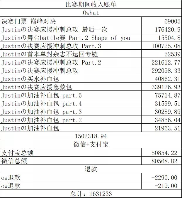 也就在昨天,Justin最大的粉丝站Justinmyeyes明昊中文首站,发布了整个赛程的集资明细,集资收入总计163万,支出主要是爱奇艺账号、直拍、小红书、定制卡和其他,其中定制卡就花了127万,爱奇艺账号花了32万多。