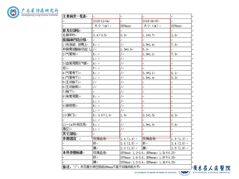 6)我院2018-06-07复查PET/CT:右肺中叶1.1*0.7cm,SUVmax2.6,1组、2组、4组、10组、11-14组等区域淋巴结多发转移。当时放疗科会诊:考虑双侧锁骨上淋巴结均肿大,纵膈淋巴结多发转移,放疗范围较大,暂不考虑根治性放疗。