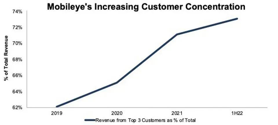 而且,Mobileye 的业务越来越集中于少数客户。如下图所示,Mobileye 的前三大客户占 Mobileye 1H22 收入的 73%,高于 2019 年的 62%。