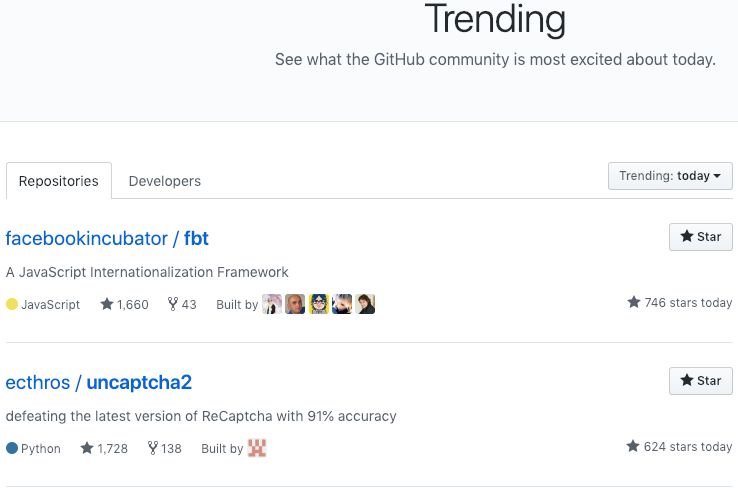1 月 5 日,GitHub 趋势榜中排第二的开源项目是一个用 Python 实现的 uncaptcha2,它是最近美国马里兰州大学 CS 系的几位研究员一起公开的。该项目宣称,攻破(当前最新版的)ReCaptcha 的准确率达到了 91%。