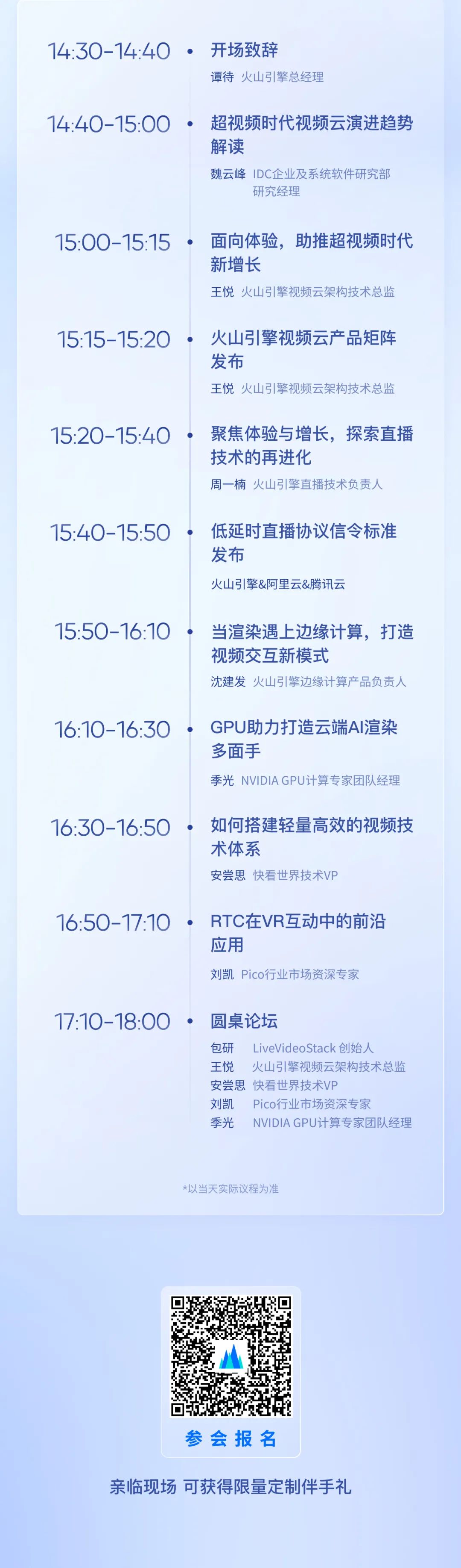 在本次峰会上火山引擎将展示最新视频云产品矩阵动态,着重分享“播放体验、互动体验、画质体验、性能体验”四大方向,解锁超视频时代的“新看法”。并针对热门行业解读视频云关键技术,帮助企业快速搭建轻量高效的技术体系。