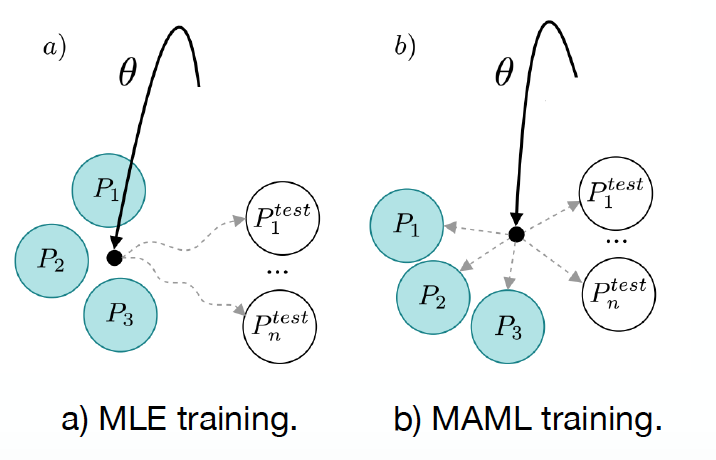 MAML 是元学习中的一类方法,它具备模型普适性,通过在meta tasks上进行预训练,能够帮助模型找到一组最合适的参数,使其快速适应新任务。例如下图[9]给出了一个 MAML 和MLE 训练对比示意图,每个圆圈都是看做一个场景,实心的是训练用的源场景,空心的是测试用的目标场景,使用 MLE 预训练会导致模型的参数过拟合到源场景上,而MAML预训练则能够找到更好的参数初始化,使得快速迁移到新场景上去: