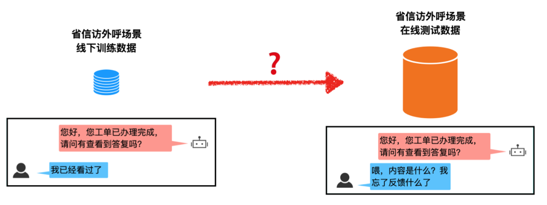 ② 鲁棒性差:有限的离线训练数据和真实的在线测试数据之间存在数据分布的差异性,会导致系统在线表现不佳和离线测试效果不匹配的情况。这种差异性主要来自于未见的用户行为(例如:新槽值、新意图、复杂句等),这类问题统称为 out-of-script 问题,可以用来验证对话模型的鲁棒性。例如下图中,训练数据中从未出现过“喂,内容是什么?我忘了反馈什么了” 类似的用户语句,一旦真实上线,模型很容易预测出错误的结果,从而影响用户体验。尤其是当数据量少的时候,模型对于在线数据的鲁棒预测会进一步下降。因此如何解决线上线下数据不匹配,提高端到端对话模型的鲁棒性是另一大挑战。