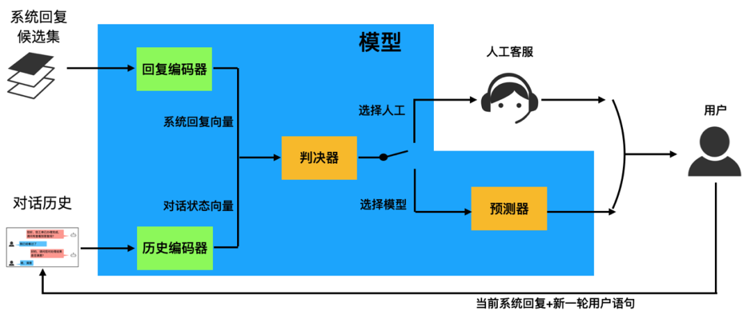 而在人机协同的框架下[1],为了能够做到智能高效地转人工,端到端对话模型还会多出一个判决器模块,专门用于判定当前对话是否转人工,如果转人工则交给人工客服解答,否则模型自己给出答案。如下图所示: