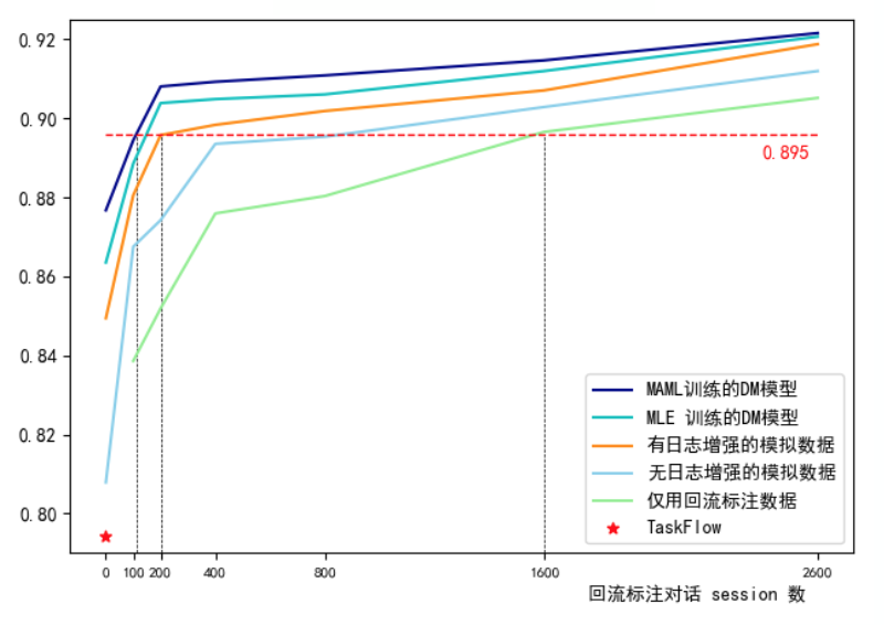 横轴是adaptation时使用的标注对话数据量,纵轴是回复准确率。可以看到,如果直接使用 TaskFlow,整个对话系统的准确率仅在 79% 左右。但是用上MDS 模型进行数据迁移和MAML 优化之后,我们可以得到最上面那条曲线,冷启动效果从 79% 提升至88% 左右,并在不同 adaptation对话数据下都能有着持续最好的表现。