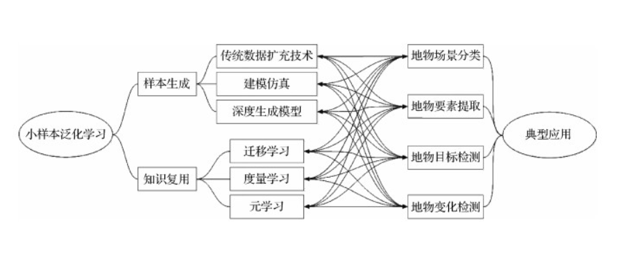 现有的解决思路可以归为两大类:一类是结合遥感图像特性进行样本智能化扩充,从而满足模型训练时的数据量需求;另一类则是从知识复用的角度出发,按照迁移学习、元学习和度量学习等策略引入先验知识,辅助在新地物类别上的学习,从而实现降低算法对遥感样本数据量需求的目的,完成小样本遥感智能解译。