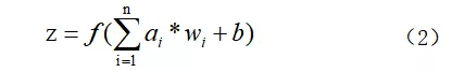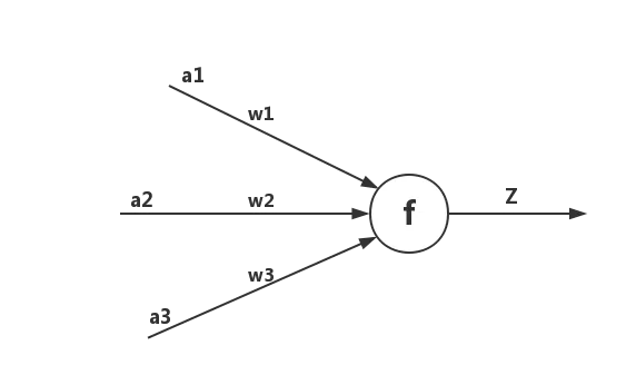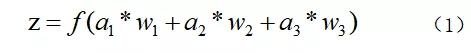 其中a表示输入,w表示权值,一个表示连接的有向箭头可以这样理解:在初端,传递的信号大小仍然是a,端中间有加权参数w,经过这个加权后的信号会变成aw,因此在连接的末端,信号的大小就变成了aw。在神经元处加权信号求和通过函数f就得到了输出Z,公式如下: