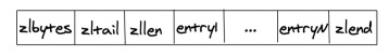 1、zlbytes:用于记录整个压缩列表占用的内存字节数