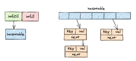 /* * 字典 */typedef struct dictEntry { // 键 void *key; // 值 union { // 指向具体redisObject void *val; // uint64_t u64; int64_t s64; } v; // 指向下个哈希表节点,形成链表 struct dictEntry *next;} dictEntry;